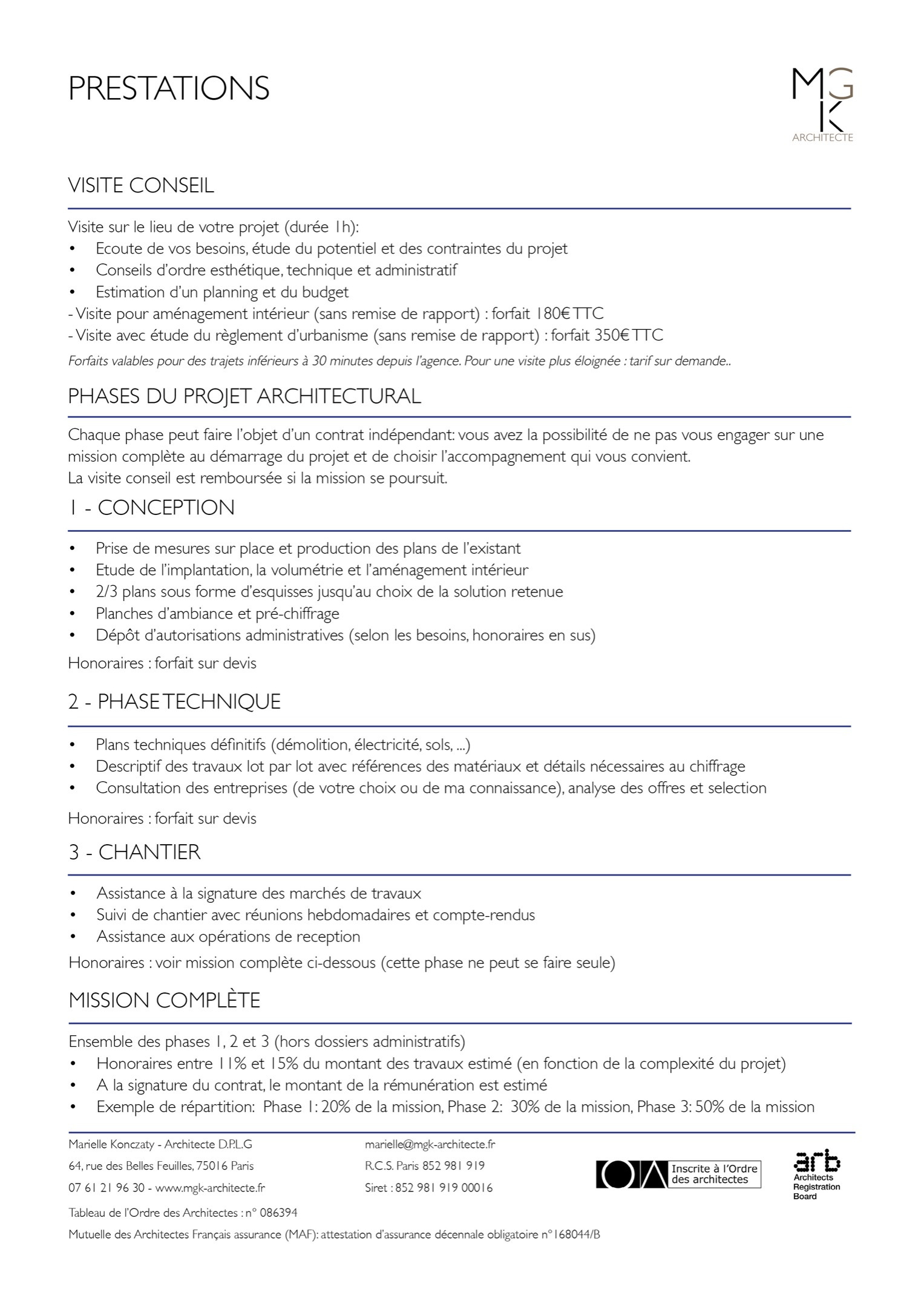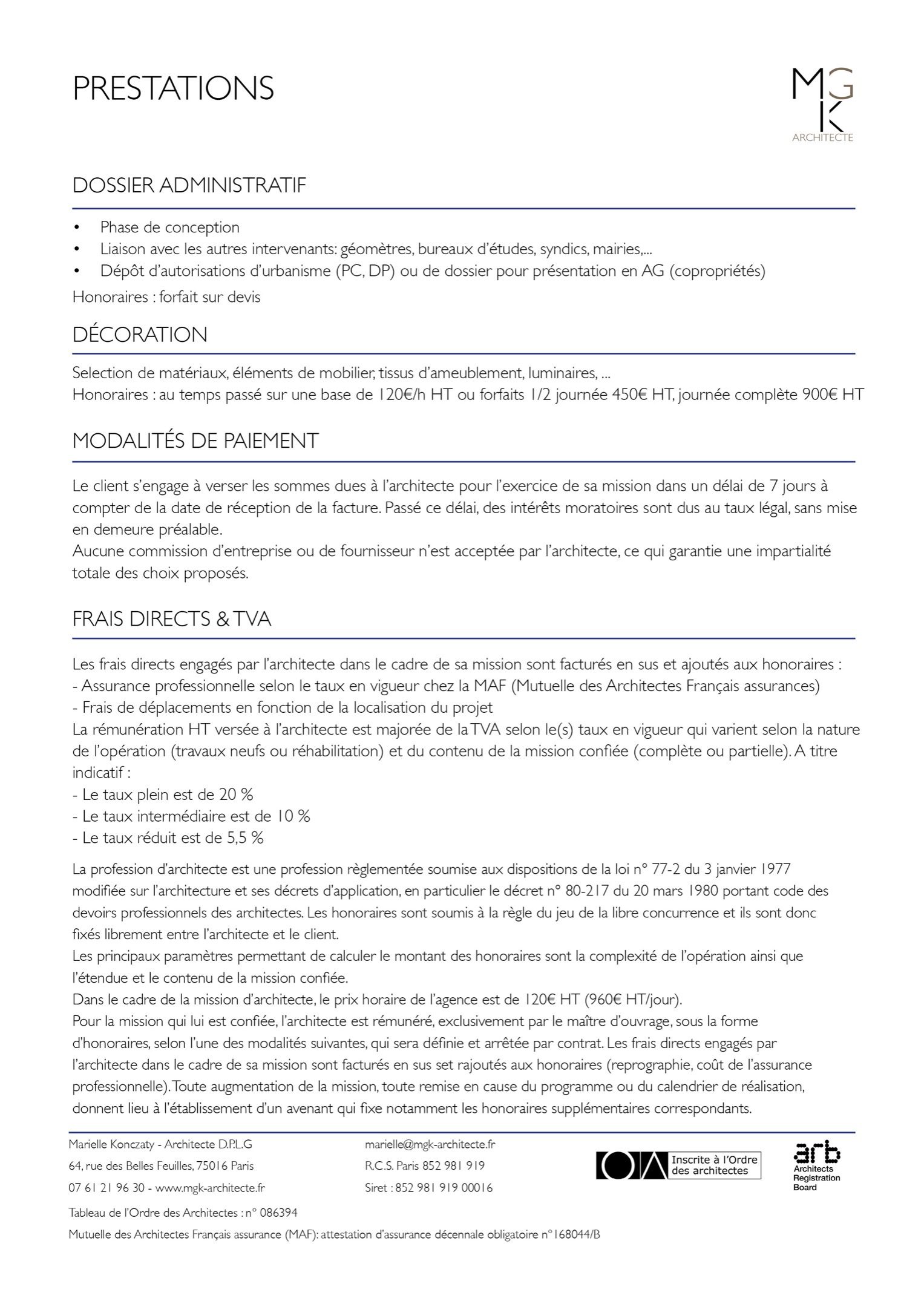 Prix des prestations